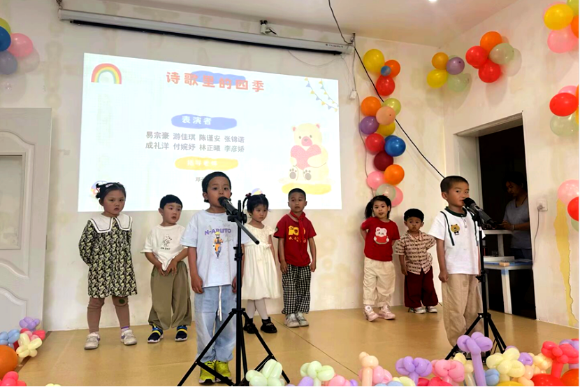 活动伊始,大学生志愿者以合唱《你笑起来真好看》开场。随后,在舞蹈表演《马德里不思议》环节,志愿者与孩子们默契配合,将西班牙风情与童真童趣完美交融,用轻快灵动的舞步迅速点燃现场氛围;在乐器表演环节,志愿者创新性地将非洲鼓与铃铛结合,带领孩子们共同完成了一段富有活力的节奏表演。