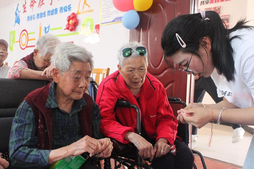 在端午祈福环节,学生志愿者将象征“辟邪纳吉、祈福安康”的祈福五彩绳系于老人手腕,此举承载着对长者安康顺遂的真挚祝愿,并传递出端午文化中“祈福纳祥”的美好寓意,让端午习俗在关怀行动中绽放出独特的温情光芒。