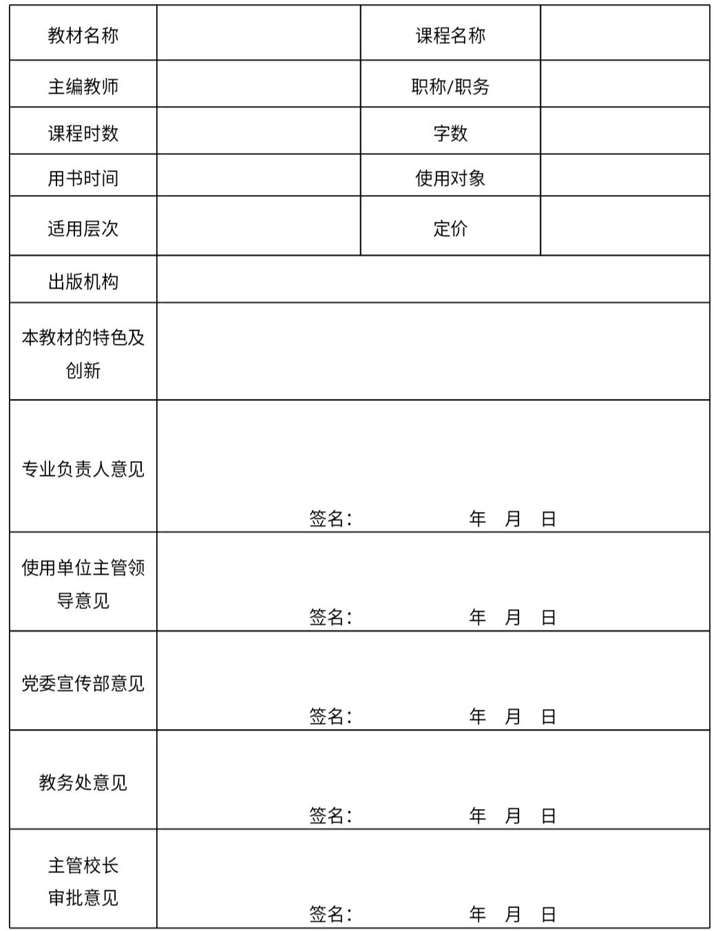 (一)自编教材提交使用时,由主编教师和使用单位提出申请,填写《湖北民族学院自编教材使用申报表》(附件2),经专业负责人和所在学院主管领导同意,连同自编教材电子版和样书交教务处。
