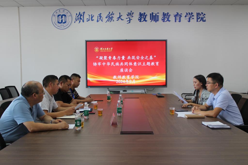 本网讯(通讯员 胡聪颖)9月19日下午,学院在9A505会议室举办了 “凝聚青春力量 共筑安全之基”铸牢中华民族共同体意识座谈会。bat365在线中国登录入口学生工作部副部长何永红、保卫处副处长李建华、学生工作部民族事务办公室主任谭学文、保卫处政保科科长徐拥军、教师教育学院学工办主任成润、辅导员尼沙、吾卜力参加了本次活动,会议由教师教育学院党总支副书记曹骞主持。