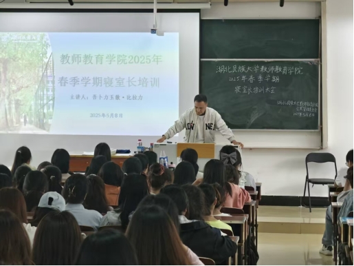 本网讯(通讯员 王清芳 朱妮娅 廖斯炜)5月8日,教师教育学院举办2025年寝室长专题培训会,主题为“明确职责使命,共建和谐寝室”。会议由辅导员吾卜力主持,全院寝室长参加培训。