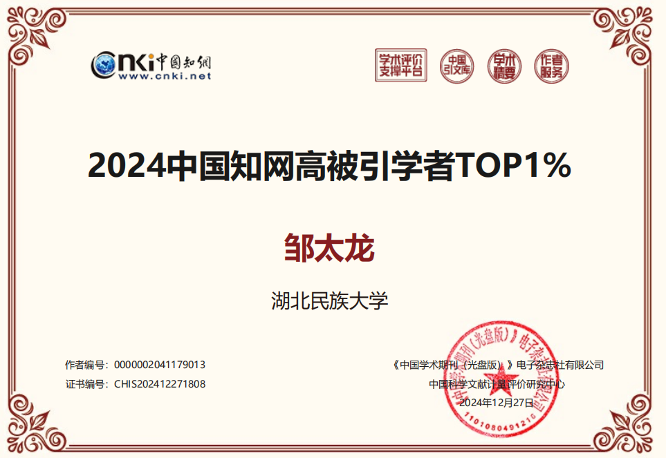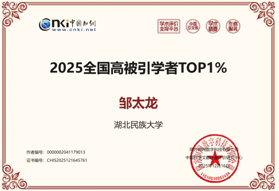 近日,中国知网旗下的中国科学文献计量评价研究中心正式发布“2025全国高被引学者”名单。该名单遵循“聚焦高影响力成果”与“贡献度量化”的总原则,旨在客观、科学地衡量并表彰国内学界具有突出科研成就和广泛学术影响力的学者。我院教师邹太龙副教授入选“2025全国高被引学者TOP1%”,这也是该同志继去年上榜之后的再度入选,这不仅是对其持续深耕教育研究所做出的学术贡献的认可,也彰显了我院师资队伍建设的成效。