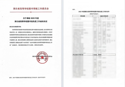 此外,在本次年会的先进评选中,图书馆刘双燕老师、杨雨琪老师凭借在读者服务、资源建设及业务管理中的突出贡献,被评为“2025年湖北省高等学校图书馆先进工作者”。