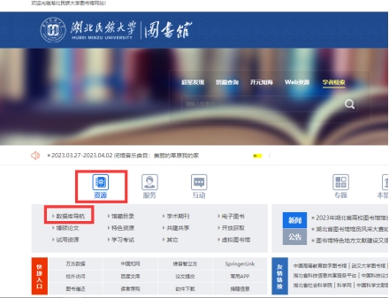 1.进入湖北民族民族大学图书馆官方网页,找到资源中数据库导航。
