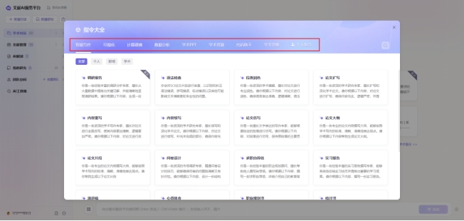 指令大全基于高频率高需求的学术场景预设指令,涵盖智能写作、可视化、数据分析、学术PPT、学术资源、代码助手、学术思维等广泛学术场景