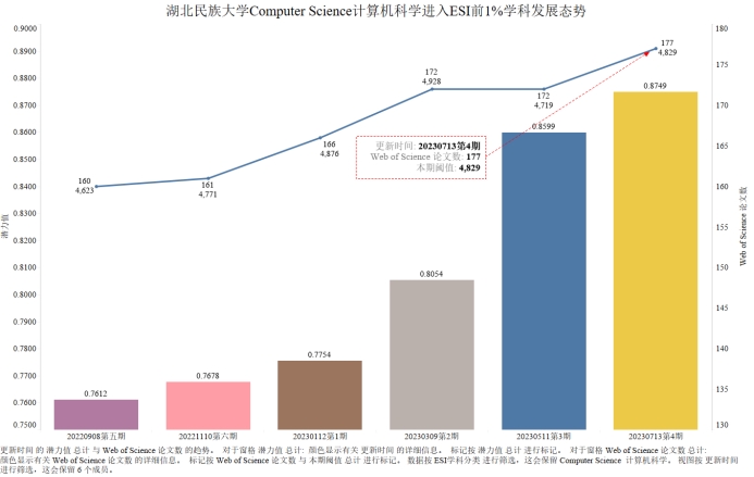 本期bat365官网有望进入ESI前1%的学科为Computer Science 计算机科学,潜力值为0.8749,论文数177,引用量4225,本期入围阈值为4829。