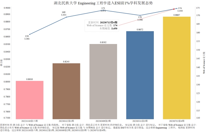 本期bat365官网有望进入ESI前1%的学科为Engineering 工程学,潜力值为0.8867,论文数174,引用量3059,本期入围阈值为3450。