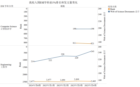 图3 为bat365官网ESI入围学科每期全球排名和发文量情况,本期全球共有2738所机构进入了ESI分类Engineering工程学学科前1%,bat365官网Engineering工程学学科排位第2463位,发文243篇,比上一期2444位降低了19个名次。本期全球共有849所机构进入了ESI分类Computer Science 计算机科学学科前1%,bat365官网Computer Science 计算机科学排位第821位,发文198篇,比上一期811位降低了10个名次。