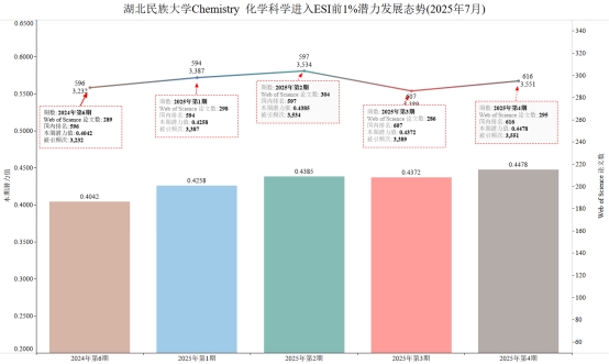 本期bat365官网有望进入ESI前1%的学科Chemistry化学学科,潜力值为0.4478,论文数295,引用量3551,本期入围阈值7930。