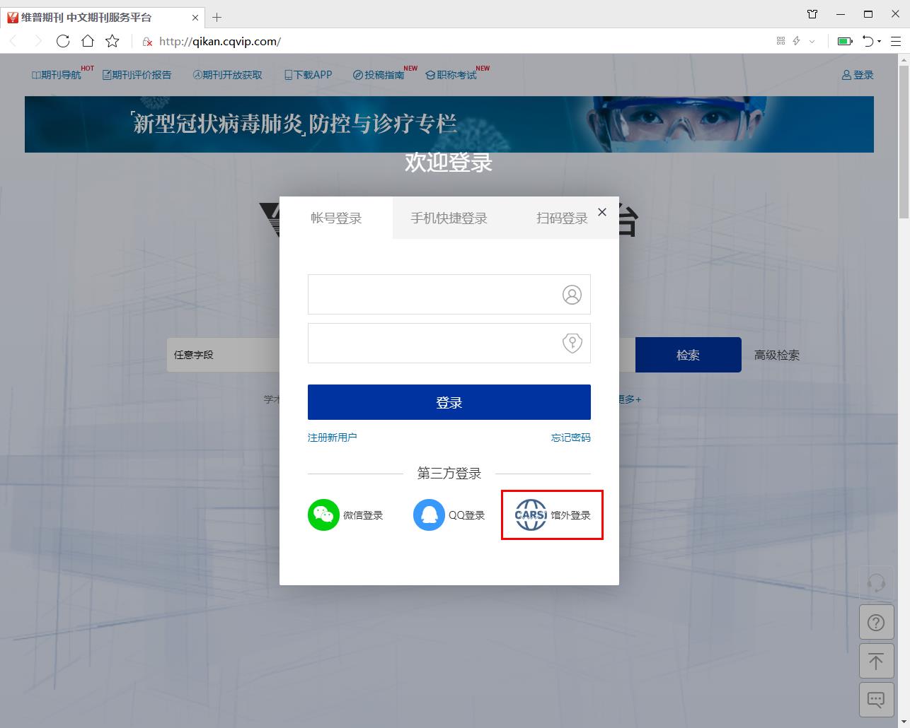1、使用非校园IP地址打开浏览器,输入http://qikan.cqvip.com/点击登录按钮,进入登录界面,选择“通过 CARSI馆外登录”按钮。
