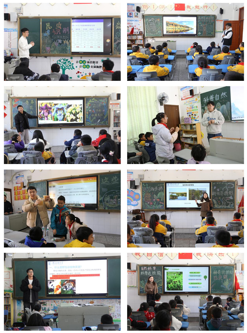 此次宣讲主题分别为昆虫识别与森林病害概论(主讲人:肖凯童)、森林——我们赖以生存的家园(主讲人:艾鑫)、奇特花卉——花卉中的“妖魔鬼怪”(主讲人:韦绪卉)、古老的活化石植物——水杉(主讲人:黎航)、水土保持这些事(主讲人:陶文、张舜阳)、因生物多样,拥精彩世界(主讲人:钟明月)、野生动植物资源的保护与利用(主讲人:兰德淼)、神奇的植物——泥炭藓(主讲人:邹庆)、水中燕窝——莼菜(主讲人:黄厚云)、牡丹绽放,国色天香(主讲人:黎可欣)。