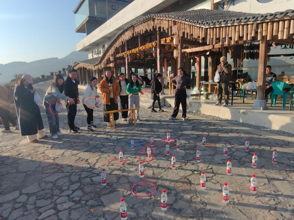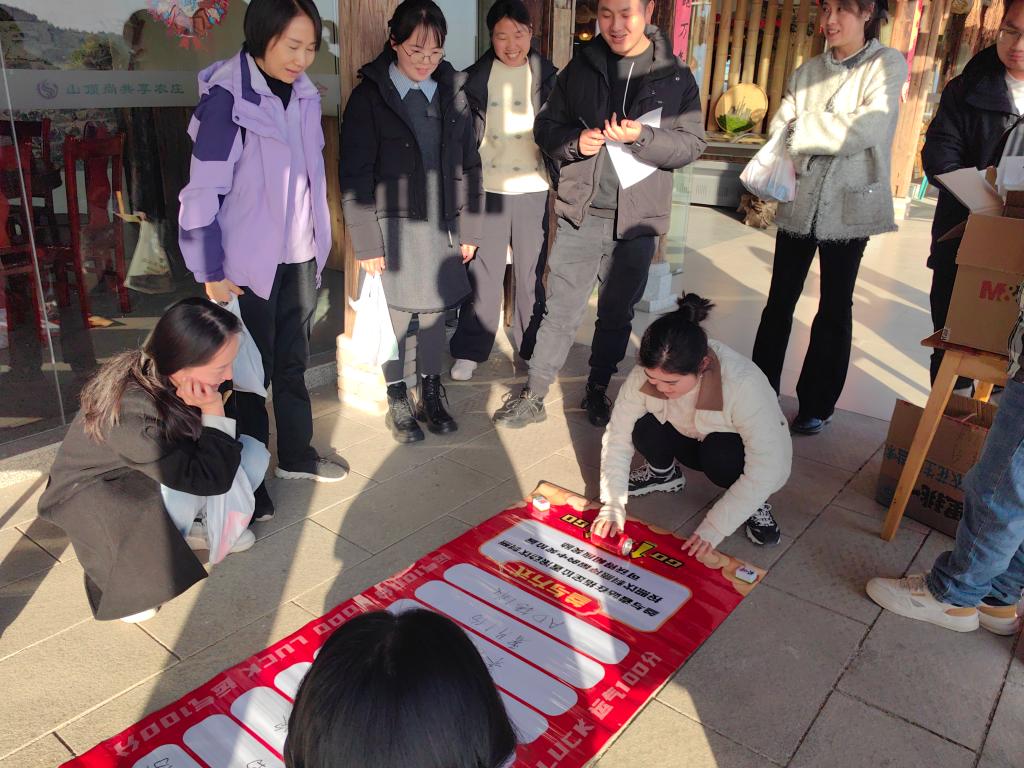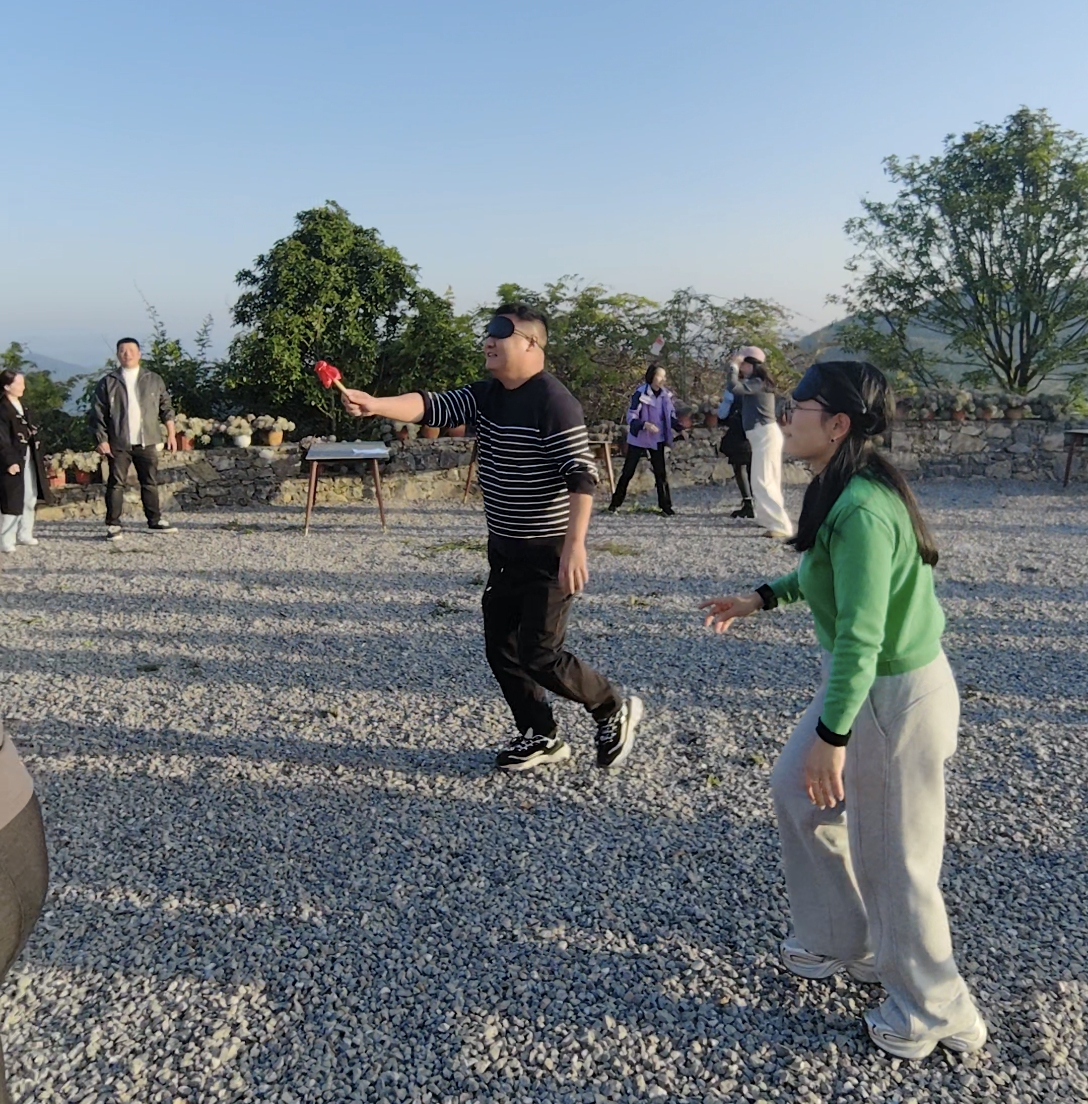 置身于秀美的自然景观中,“蒙眼敲锣”“时来运转”“圈圈夺宝”“好运滚滚来”等趣味游戏精彩纷呈。活动现场气氛热烈,各队成员默契配合:有人在“蒙眼敲锣”中因方向指引不一而“迷失”,引发阵阵欢笑;有人在“圈圈夺宝”时精准投掷,赢得满堂喝彩。欢声笑语与加油呐喊在山谷间回荡,奏响了一曲生动的团队协奏。