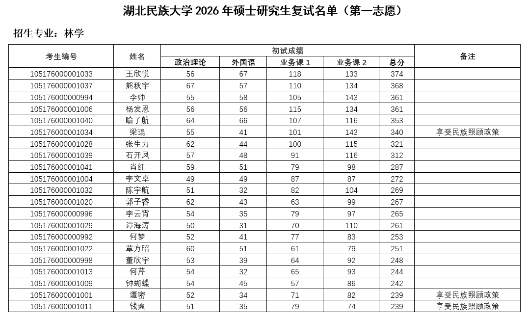林学园艺学院2026年硕士研究生招生复试名单(第一志愿)