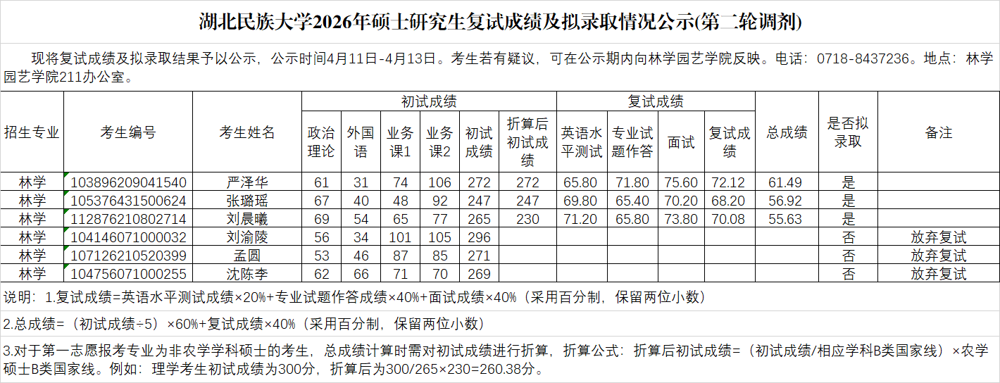 林学园艺学院2026年硕士研究生复试成绩及拟录取情况公示(第二轮调剂)
