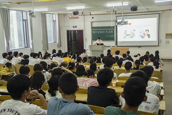 黄晶晶从校园贷和电信诈骗两大板块展开,讲述如何防范金融风险。她先是阐述校园贷的五大危害,举例各高校真实案例,进一步表明校园贷承受的是生命的代价。紧接着,她从兼职利诱、赌博、超前消费等方面阐明如何杜绝校园贷。黄晶晶表示,建立良好征信记录,塑造个人经济体系,是防范金融风险的基础。随后,她从“什么是电信诈骗”“电信诈骗常见方式”“如何识别防范电信诈骗”等方面论述如何防范电信诈骗。最后,黄晶晶从“十个守则”和“八个凡是”这两个防范金融风险的基本原则,提醒新生提高警惕,远离电信诈骗。