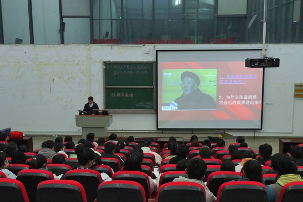 本网讯(见习通讯员 黄海娇 姚佳瑞 刘荣/文 关蓉/图 )11月26日晚,我院在修远楼5B403教室开展“向建党一百周年献礼,争做新时代的‘张富清’”红徽章宣讲活动。本次活动旨在让我院团学干部了解学习张富清不惧困难,甘于奉献,坚守初心的优秀品质,由红徽章项目组成员张祖鑫进行授课,全体团学干部到场。