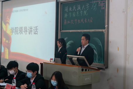向鹏代表学生会做主题为“紧跟党指挥,奋进新百年,激励全院青年学生在新时代释放青春力量”工作报告,他在报告中总结学生会近年来的突出工作成绩,感谢全体学生对学生会工作的支持和配合,并对今后工作计划提出展望,坚持党组织的全面领导和明确自身定位,繁荣学院文化,团结带领全院学生书写新篇章。