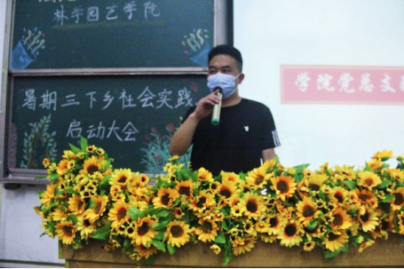 大会开始,赖申昊发言。他指出,大学时期参加社会实践活动是学生成长成熟的必由之路和不菲的财富,暑期社会实践则为学生搭建起一个提升自己,改造自己的舞台。他用自己的亲身经历向学生强调社会实践的重要性,并在此基础上提出期许:抓住暑期社会实践机会,培养能吃苦敢拼搏精神,丰富阅历见识,找到自己的下限;把社会实践活动与双创相结合,结合专业知识找到适应的选题,锻炼自己,走出校园,走向社会;与大学生社会价值相结合,不负青春,不负时代,在青春成长道路上开放绚丽之花。