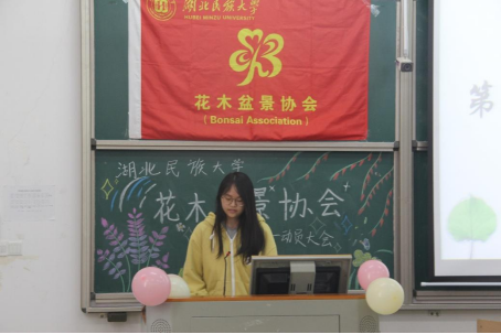 花木盆景协会第十六届会长曾宵通过播放花协招新视频介绍花协的整体情况。花协成员张雨欣从基本情况、工作方向、社团宗旨、分设部门、社团荣誉方面对花协进行简要讲解,向学生展示插花课、水晶滴管等特色活动。