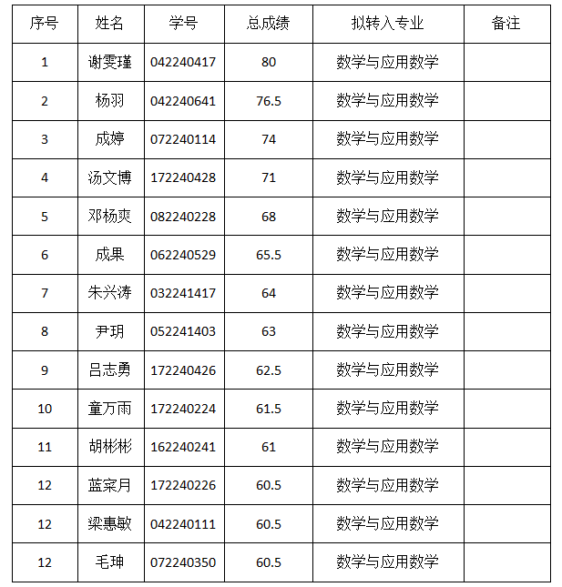 根据《bat365在线中国登录入口2022级普通本科学生转专业工作方案》、《数学与统计学院2022级学生转专业工作实施细则》,数学与统计学院2022级普通本科学生转专业工作考试环节已完成。现对申请转入数学与统计学院的2022级学生成绩进行公示,公示时间:2023年2月17日—2023年2月20日。请全体师生对公示名单进行监督,如有异议,请在公示期内向数学与统计学院学生科反映。