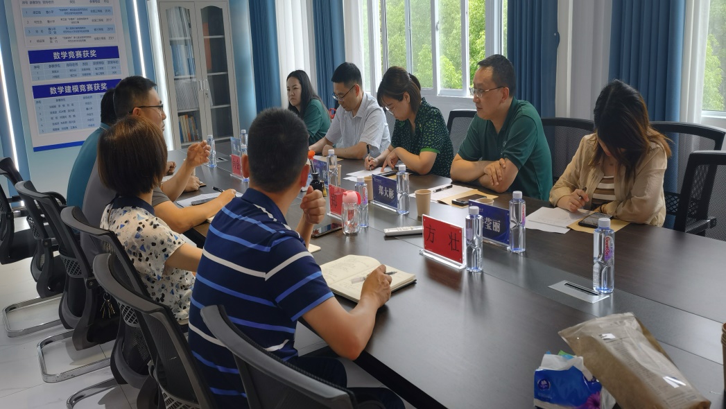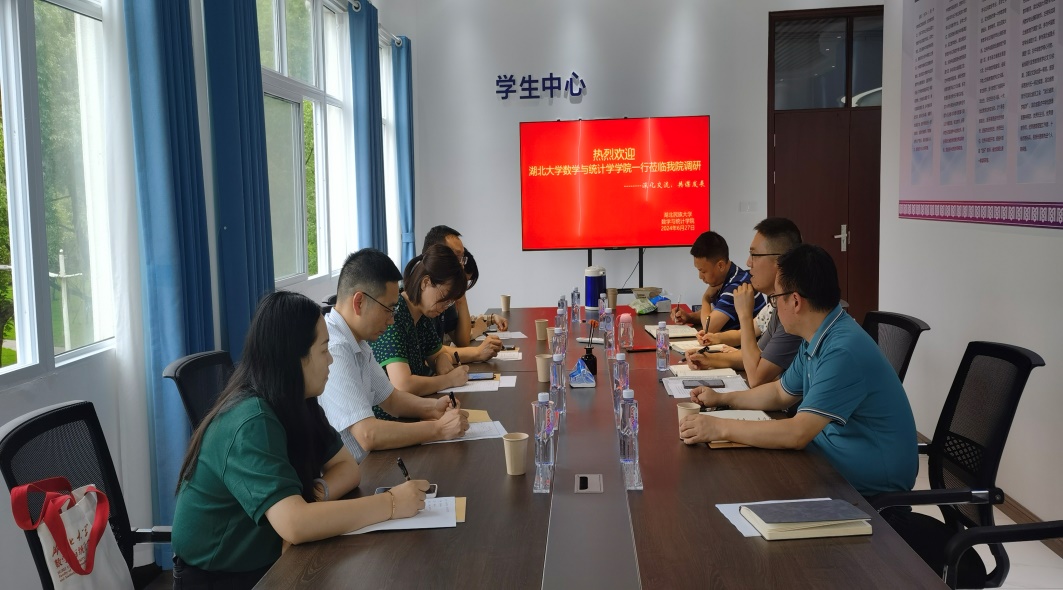 6月27日下午,湖北大学数学与统计学学院党委书记周霞、副院长郑大彬、副院长廖军、统计系副主任潘莹丽、团委书记陈慧一行来我院就学科和专业建设相关工作进行调研。我院院长唐利明、党总支副书记郑敏、副院长向会立、统计系主任方壮、创新中心主任陈尧参加了座谈会,会议由唐利明院长主持。