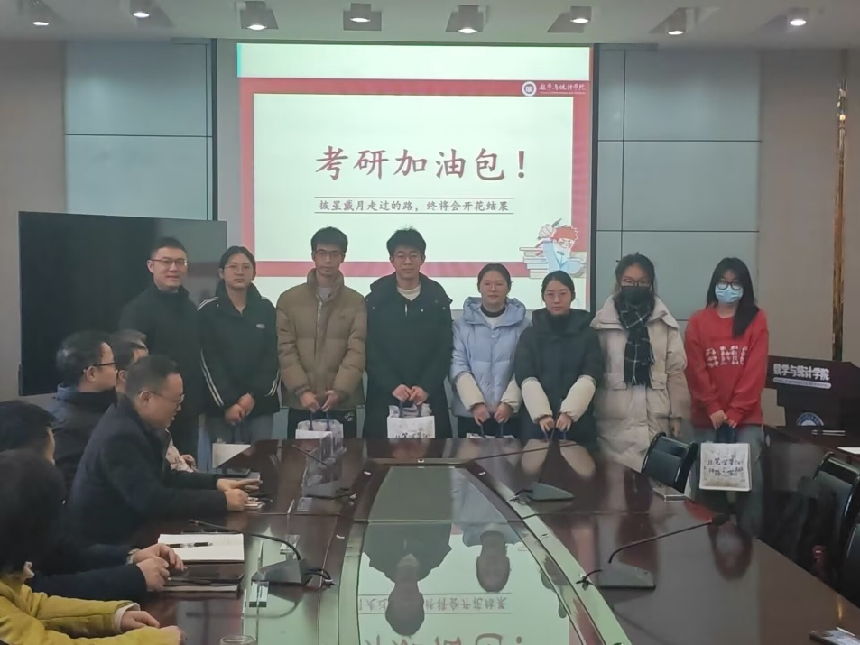 为鼓舞2026届考研学子士气,缓解考研学子冲刺阶段备考压力,传递学院关怀与支持,12月18日上午,数学与统计学院在四楼会议室组织开展“数海逐梦,研途领航”考研加油包发放活动。学院领导、毕业班班主任、学生科负责人与2026届考研学生代表共同参加活动。