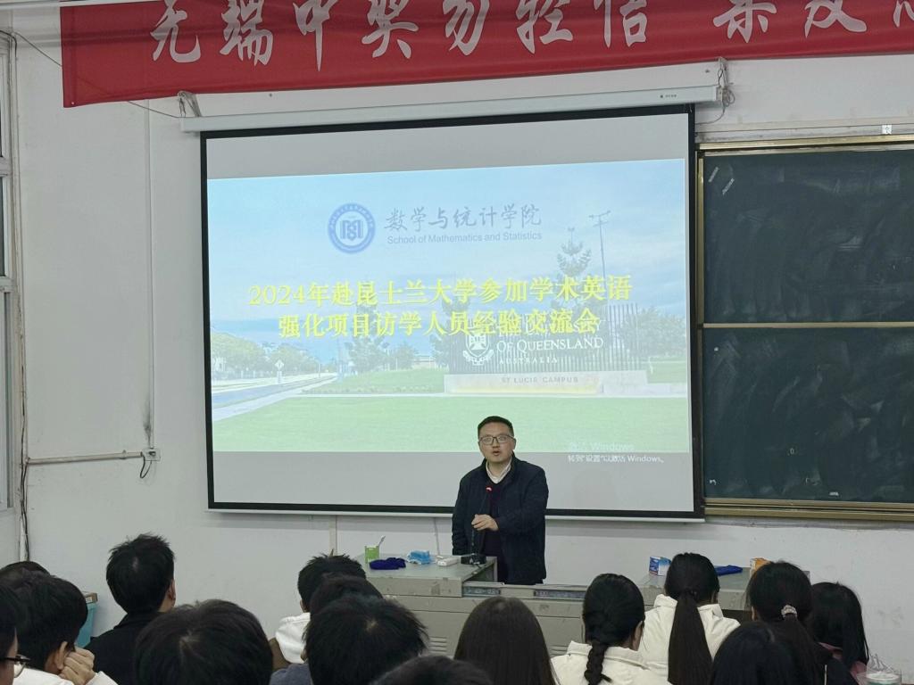 2024年11月27日晚,数学与统计学院研究生访学澳洲回国经验分享交流会在3308教室召开。本次会议由第五届研究生会办公室副主任班苗苗主持,向会立副院长、王清龙老师以及周雄老师莅临指导,研一、研二全体学生参加。