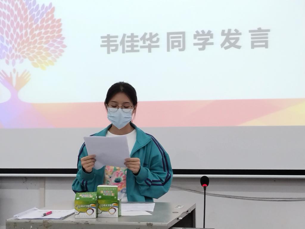 会议伊始,由主持人带领同学们进行志愿者宣誓,展示过去一年的志愿服务中同学们的风采。接着,分别由2020级、2021级优秀志愿者代表冉涛涛和韦佳华同学发言。冉涛涛同学指出志愿服务对个人、社会都有益处,志愿服务既是助人,也是助己,既是乐人,也是乐己。希望志愿者们更加努力努力服务同学,服务社会。韦佳华同学向大家阐述志愿服务含义,带领大家回顾过去的志愿服务活动,说明志愿服务就是历练自己的一个过程,大家要继承中华民族的优良传统,切实推进精神文明建设。
