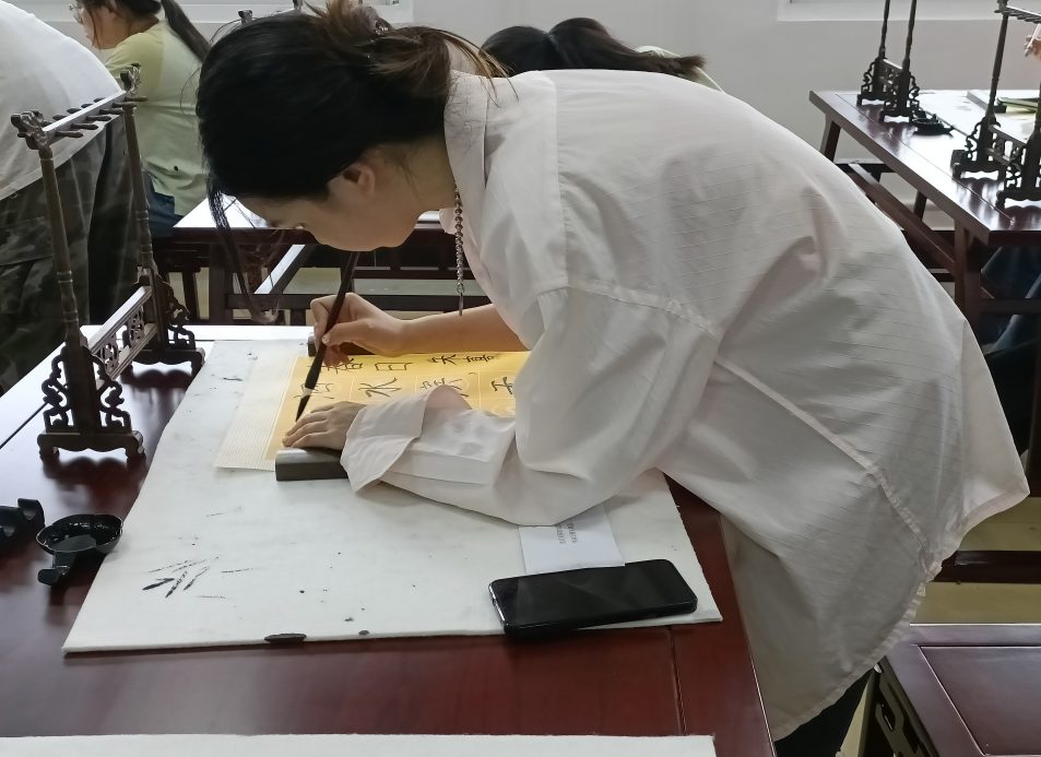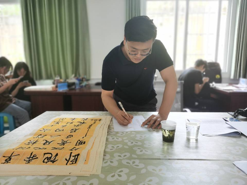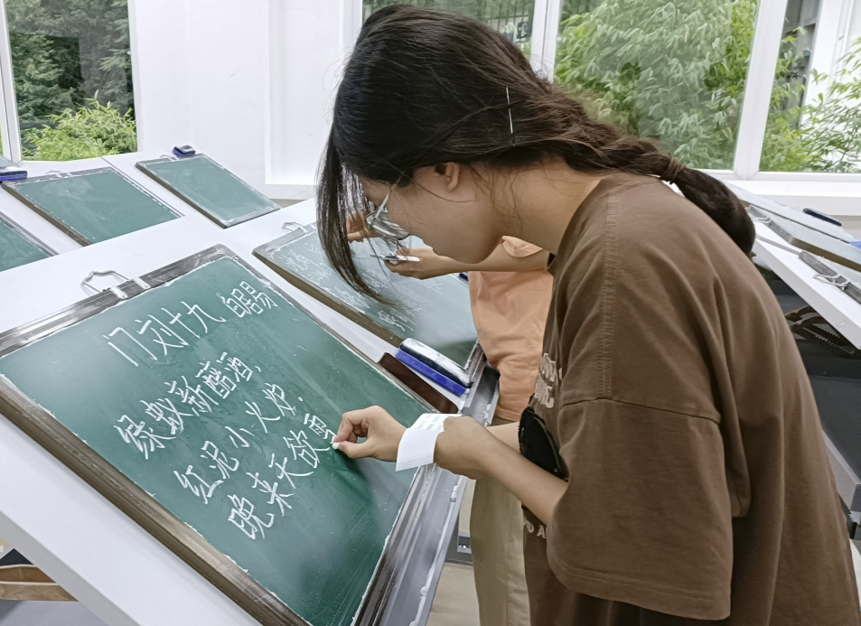 活动伊始,参赛选手们早早的来到比赛现场,首先在9b401教室候场,在工作人员的安排下依次有序前往9b402教室书写粉笔字。他们手持粉笔,满怀激情,用心写好每一个字。紧接着,写完粉笔字的同学前去9b503教室继续书写毛笔字和硬笔字,同学们伏首在案桌上,泼墨挥毫,方块字或苍劲有力,或隽永飘逸,或清秀雅致,充分彰显我院学生深厚精湛的书法技艺。