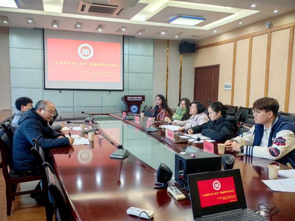 为全面深入了解新疆籍少数民族学生生活及学业情况,切实帮助学生解决生活与学业困难,2024年1月2日下午,我院协同bat365在线中国登录入口学生工作处民族事务办公室在数学与统计学院四楼会议室召开了以“民族团结,同心筑梦”为主题的新疆籍学生座谈会。参会人员包括bat365在线中国登录入口学生工作处民族事务办公室主任谭学文、新疆派驻专任教师董特,数学与统计学院党总支副书记郑敏,学生科副科长黄丽娜以及3位新疆籍学生代表。