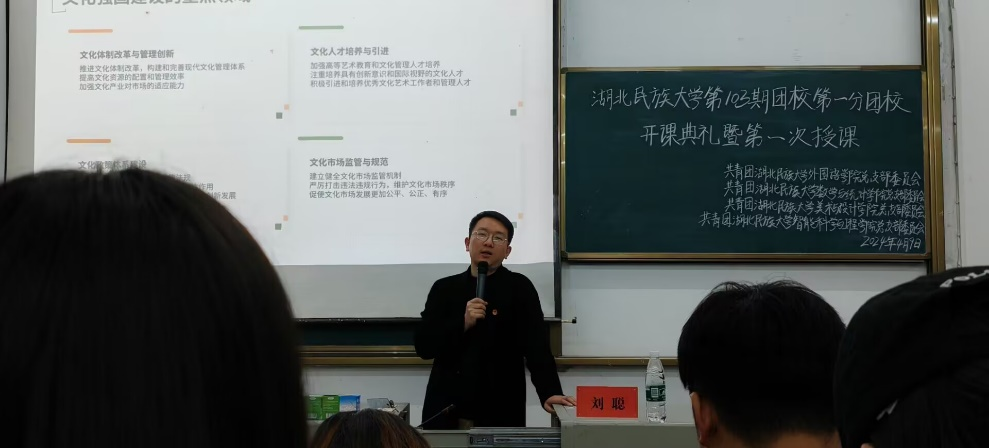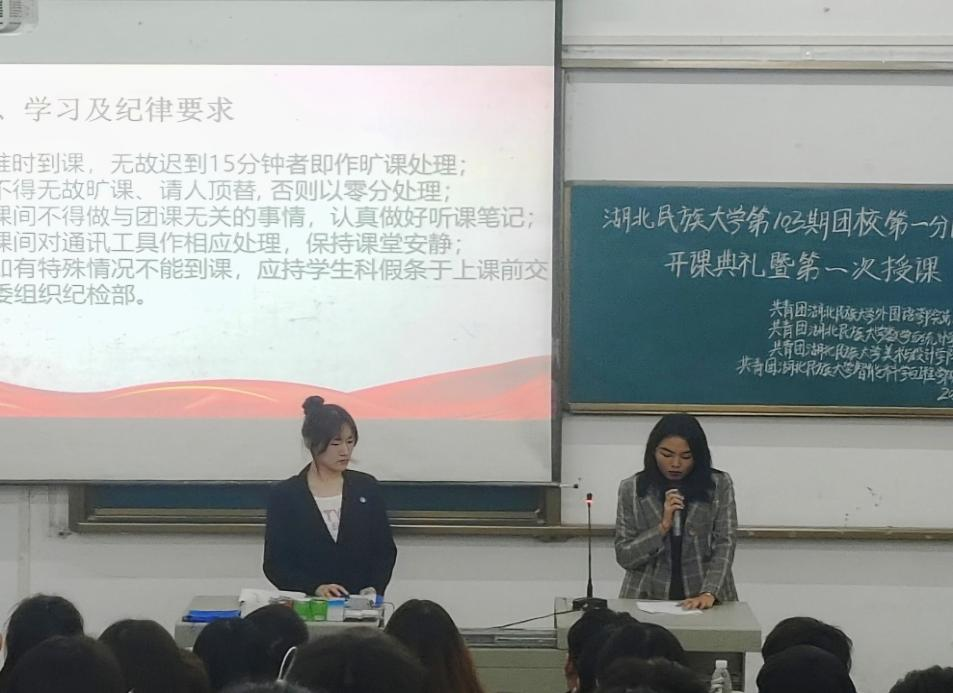 提升共青团员思想理论水平和政治素质,进一步增强广大学生的团员意识,加强团员队伍建设。bat365在线中国登录入口第103期团校第一分团校开班仪式于2024年4月9日晚在数学与统计学院开展。数学与统计学院团总支书记刘聪,外国语学院团总支书记周婷出席本次开课典礼。数学与统计学院、外国语学院、美术与设计学院、智能科学与工程学院团校成员到场聆听。