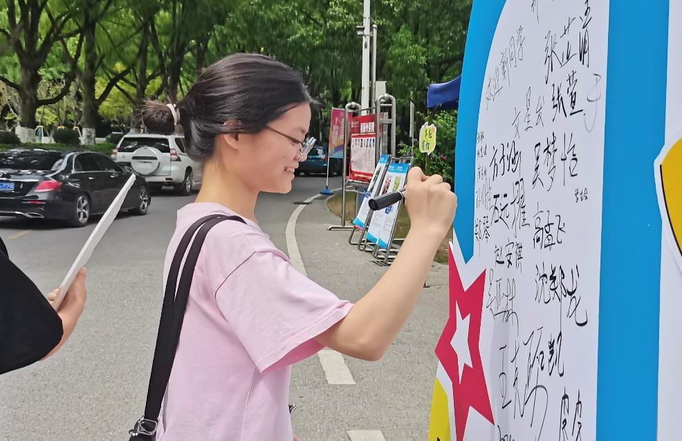 (学院新生在展板上签名留念)