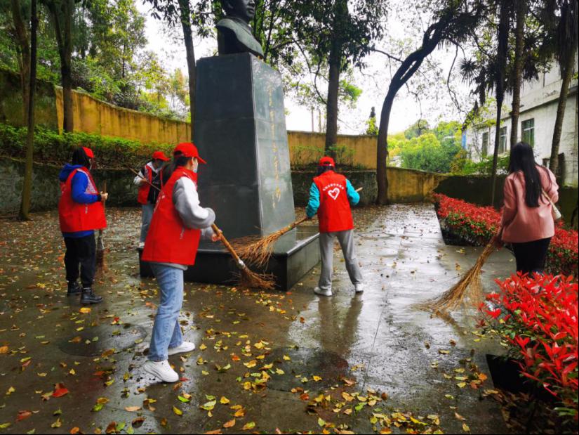 (学生党员和志愿者正在清扫叶挺将军纪念碑)