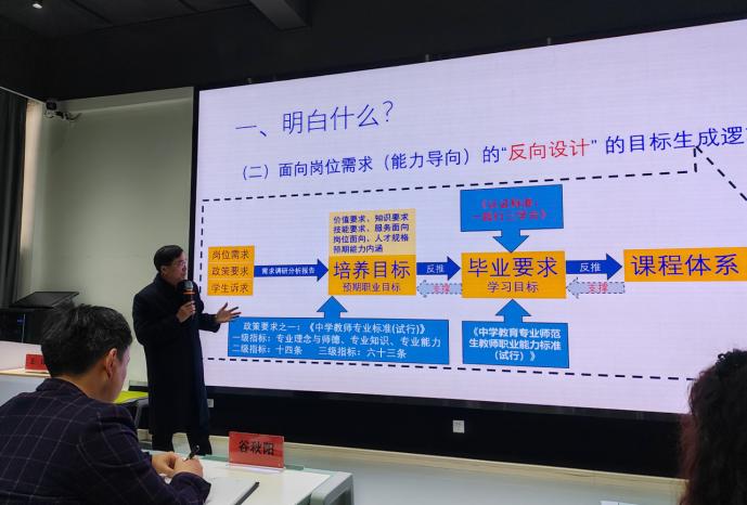 王锋教授以“师范专业认证老师要明白什么?要做什么?做了什么?”为主题,解读了师范类专业认证“以学生为中心的核心理念”的育人逻辑。从学院层面、专业层面以及专业教师的三个层面,讲解了师范专业认证要做什么,从专家查证和专业举证两个方面,阐述了我们面对师范专业认证做了什么。