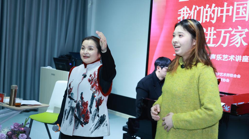 本次讲座是以课堂学员范唱与专家讲解点评的方式进行。在互动环节,吴碧霞教授对现场六位学员的演唱进行了细致入微的点评与指导,从气息控制、声音线条塑造、情感表达等方面逐一点拨,手把手传授演唱技巧。这不仅提升了学员们的专业认知,更让大家对声乐艺术的追求有了更清晰的方向。同时,在指导学员时也表达出她对民族声乐的腔韵之美、中西声乐艺术融合、民族声乐的地域传承与创新等方面的独到见解。从“腔韵的文化根源”与“技术内核”出发,深入阐释了“字正腔淳”“声情并茂”的声乐表演精髓,强调声乐演唱不仅需要扎实的发声技巧,更要注重情感的传递与作品的个性化理解,让歌声成为与观众对话的桥梁,兼具技术支撑与情感温度。她幽默风趣的语言、专业精准的指导、富有感染力的现场示范,让在场师生受益匪浅,掌声与喝彩声此起彼伏。