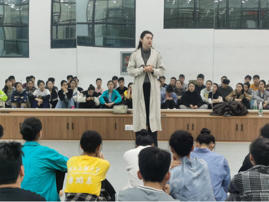 张蕊书记首先给大家讲述了大型原创民族歌舞剧《老兵》的创作背景、目的及意义,介绍了剧本艰难的创作过程,从与中央民族歌舞团搭建合作桥梁、前期不断的创作摸索,到深入恩施各个乡镇进行采风以及幕后各种艰辛的付出,才打造出这一部恢弘的《老兵》歌舞剧。随后结合党史教育,重点讲述了张富清坚守初心、不改本色,淡泊名利、无私奉献,扎根基层为党和人民鞠躬尽瘁的先进事迹。她希望同学们深入感悟张富清精神,增强舞台感染力,珍惜参演机会,克服困难,通过排练提高专业能力,通过参演提升精神觉悟。