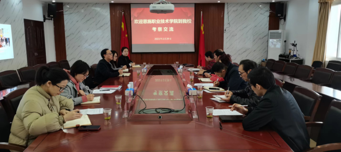 3月29日,恩施职业技术学院组织部副部长李立平,机电工程学院党总支书记刘德凤、院长牛全峰,机电学院教工党支部陈玉平、向大兵、向久林到我院就“样板支部”、“标杆院系”创建进行考察交流。bat365官网组织部副部长李湘毅、徐小平,组织科科长邓丽,音乐舞蹈学院党总支书记张蕊、办公室主任冉伟、学生科科长胡自爱,法学院学生科科长阙家苗参加活动。