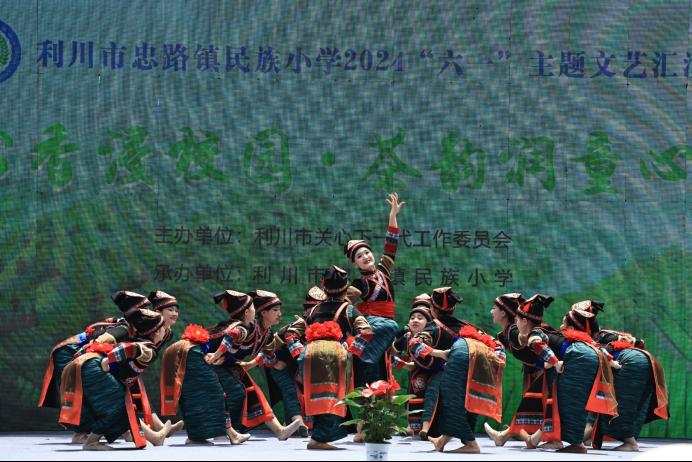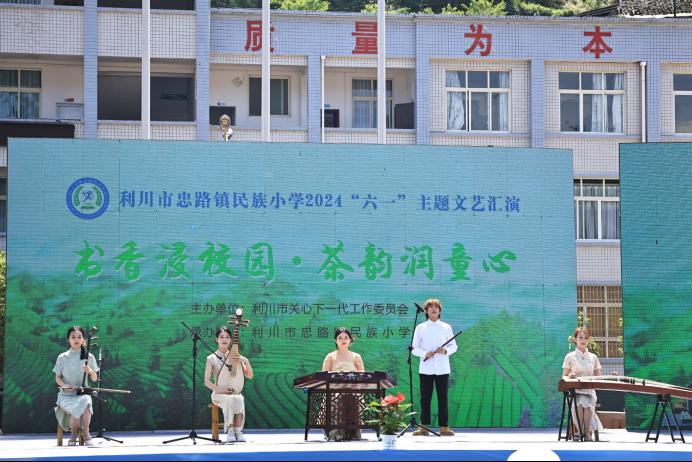 本网讯(记者 郑雅倪)5月31日,音乐舞蹈学院美育援教团队受邀参加利川市忠路镇民族小学“书香浸校园·茶韵润童心‘六一’文艺演出”活动。团队师生共为孩子们送去了三个文艺节目,分别是民乐合奏《神话》,女子群舞《幸福的脚步》和合唱歌曲《强国一代有我在》。我院学生与小朋友们同台演出,获得在场观演领导嘉宾的高度赞评,本次活动也获得圆满成功。