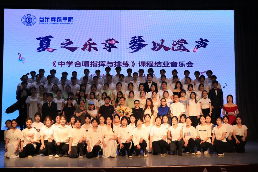 为深化音乐学专业课程教学改革,强化音乐师范性专业实践能力训练,6月18日晚,2022级音乐学专业全体学生在演播厅举办了“夏之乐章·琴以滢声”《中学合唱指挥与排练》课程结业音乐会。学院党总副支书记邓丽、教学科负责人熊霞、音乐系主任张玲玲,部分音乐学专业教师及学生到场观看。
