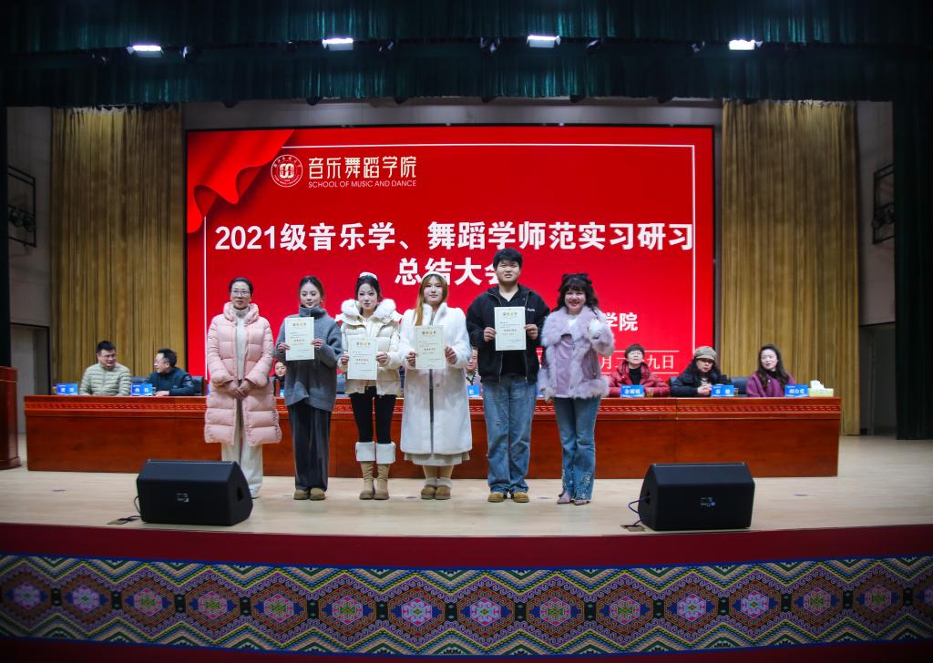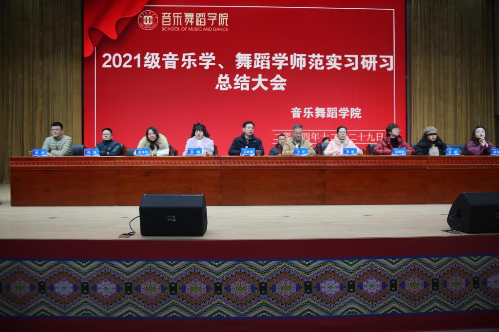 12月29日晚,音乐舞蹈学院2021级音乐学、舞蹈学师范实习研习总结大会在学校新区多功能厅顺利召开。院长谷秋阳、副院长焦娜、副书记邓丽,各系部、科室负责人、教研室主任,21级、22级音乐学、舞蹈学班主任出席会议,2021级音乐学、舞蹈学,2022级音乐学、舞蹈学专业学生参加活动。大会由副院长王松主持。