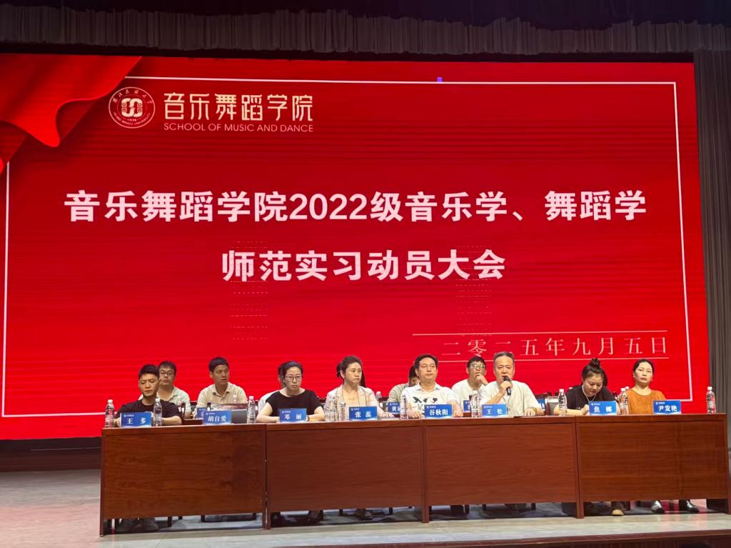 为扎实推进2022级音乐学、舞蹈学专业师范生教育实习工作,帮助学生明确实习目标、熟悉实习要求、掌握实习要点,音乐舞蹈学院于2025年9月5日下午在演播厅隆重召开2022级师范生教育实习动员大会。学院党总支书记张蕊、院长谷秋阳、副院长焦娜、党总支副书记邓丽、副院长王松,音乐学专业负责人张玲玲、舞蹈学专业负责人黄涌天,2022级音乐学班主任张岩、舞蹈学班主任张翰庭及学院各科室负责人出席此次活动。