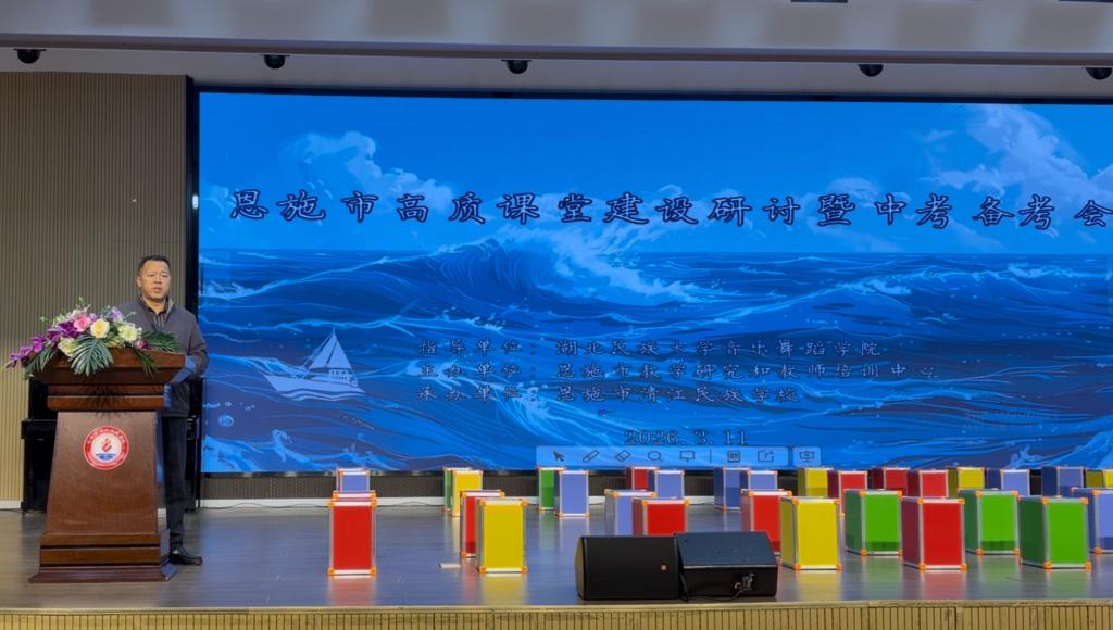 (文字:张亚朋;图片:刘灿;审核:焦娜、胡自爱)3月11日,由bat365在线中国登录入口音乐舞蹈学院指导、恩施市研培中心主办、清江民族学校协办的2026年恩施市初中音乐学科高质课堂建设研讨会暨中考备考会在清江民族学校隆重举行。全市各中学音乐教师齐聚一堂,共研教学改革路径,共话中考备考策略。我院作为活动指导单位,高度重视此次教研盛会,音乐舞蹈学院副院长焦娜、副院长王松全程关注并指导活动筹备与组织实施,音乐系师范教研室深度参与策划协调,音乐系主任张玲玲作专家讲座,20余名骨干教师及2023级音乐学、舞蹈学专业200余名学生受邀参会,充分彰显我院服务地方基础教育的责任担当与师范办学的深厚底蕴。