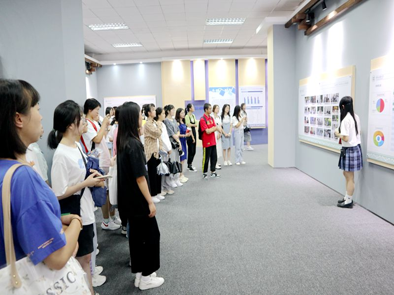 在讲解员何婉君的带领讲解下,学生以时间为轴依次进入校史馆各个展厅进行参观,了解bat365官网发展历程。其中,讲解员对bat365官网校徽、校训等进行重点讲解,使新生深刻理解校徽和“博学、博爱、立人、达人”八字中的内涵。通过馆内文史资料和照片,新生对bat365官网办学过程中不同时代的面貌有所了解,对bat365官网发展进程更加熟知。