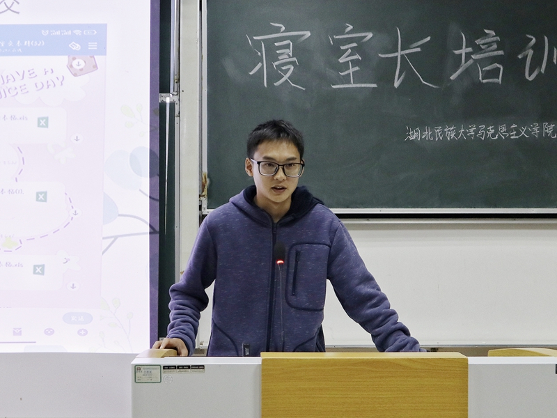 本网讯(通讯员 王婵媛 见习通讯员 赵光荣/文 谭瑞秋 孙航/图)10月31日晚上,我院公寓管理委员会在德智楼9B210教室举行寝室长培训大会,我院公寓委员会外联部部长吴思霞主持此次培训,大一、大二、大三全体寝室长参加培训大会。