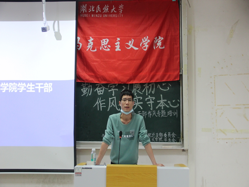 首先,毛召表示此次培训对于进一步提升我院学生干部的综合素质、增强学生干部队伍的凝聚力、更好服务马院师生具有重要意义。紧接着,他从习近平总书记“四个意识”的要义出发,希望马院学子都能牢固树立“四个意识”,以身作则,发挥学生干部的模范带头作用。随后他从态度、能力、务实三大板块展开具体阐述。态度方面,他结合自己在大学的亲身经历,教导在场学生切实履行职责,以饱满的热情和态度对待工作;能力方面,他用具体生动的事例分享沟通的技巧以及怎提高执行力的方法;实务方面,他向在场学生传授撰写通知及策划的经验,希望学生落实求真务实的工作作风。