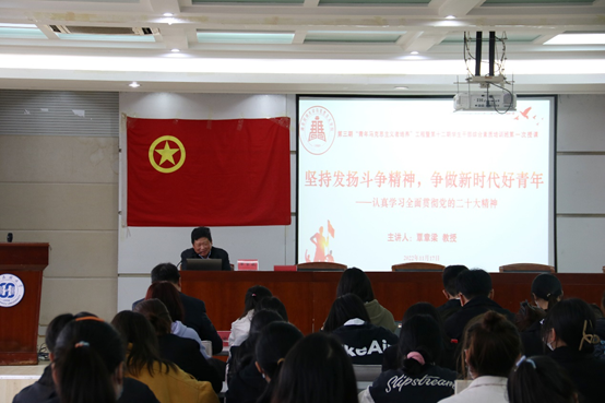 覃章梁教授为全体学员作以“坚持发扬斗争精神,争做新时代好青年”为主题的第一次授课。他以党的二十大报告中习近平总书记对青年的殷切期望为切入点,从“青年是国家的希望和民族的未来”、“大学生要争做新时代好青年”两个方面展开具体阐述。