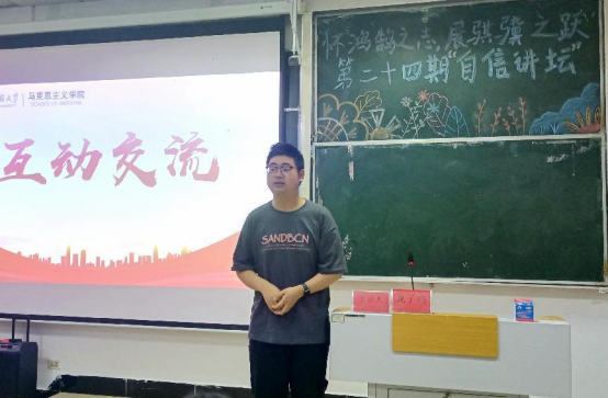 为充分发挥先进榜样的模范引领作用,激励更多青年学生奋发向上,5月29日,我院在德智楼9B208教室举办以“怀鸿鹄之志 展骐骥之跃”为主题的第二十四期“自信讲坛”活动。bat365在线中国登录入口向上向善好青年龙子鸣应邀担任主讲人,我院大一、大二全体学生参与此次活动。