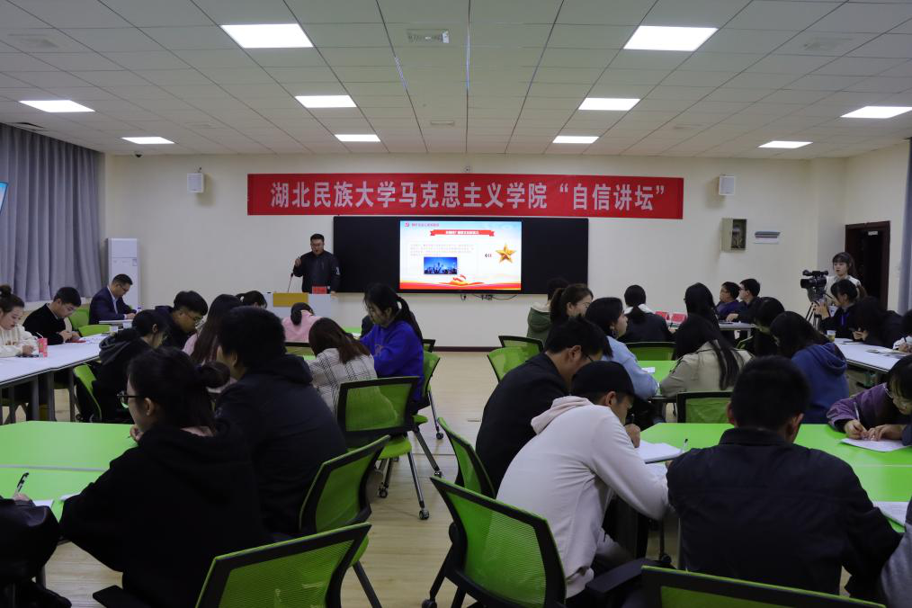 张明波主持本次“自信讲坛”。他表示希望通过“自信讲坛”品牌活动,传递党的声音,分享理论学习成果,展示优秀学子风貌,丰富校园文化生活,促进学生成人成才。