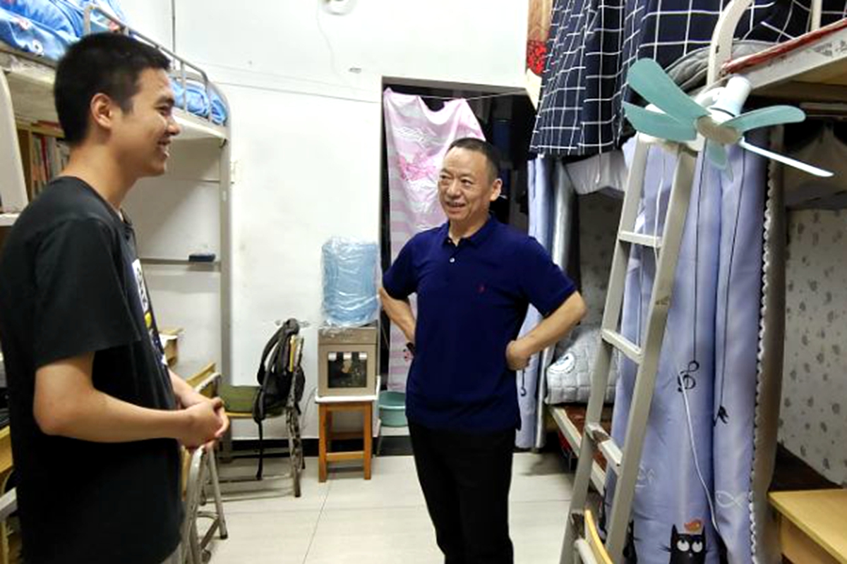 学院领导和老师共分为两队,由罗成富、徐铜柱带队,分别去到学生宿舍,围绕近期学习生活情况、本科生导师制、未来规划、学生活动、暑期社会实践、就业方向、论文开题等与我院学生进行了交流沟通,不仅仔细解答了学生提出的相关问题,还对学生反映的情况进行了详细记载。在毕业生寝室,罗成富叮嘱即将就业的学生要在新的岗位上继续努力,踏实工作,展现出马院学子良好的精神风采;鼓励暂未就业的同学要根据自身实际情况,及时调整心态和期望值,转变就业观念,先就业后择业。在大二学生宿舍,徐铜柱关心学生的生活环境问题,叮嘱学生要合理使用空调,节约用电,在疫情防控常态化的背景下要保持通风,养成良好的生活习惯。同时,他勉励学生要志存高远,珍惜时光,努力上进,成就不悔人生。