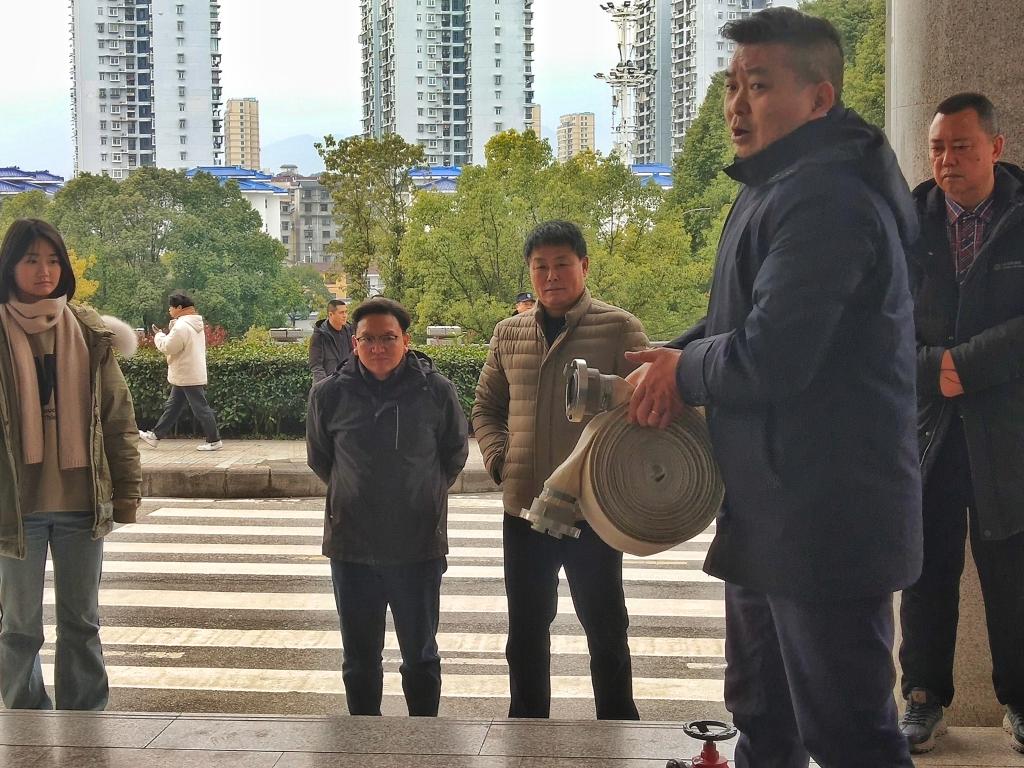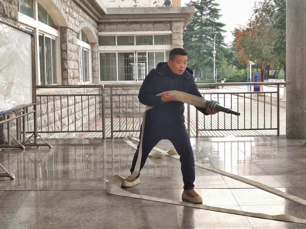 火灾演练结束后,消防科吕刚特别强调了火灾发生时的逃生技巧,并通过现场演示,向全体师生展示如何正确使用灭火器、消防水带,并强调相关注意事项和操作步骤。他提到,一是在发生火灾时,首先应判断火源位置及安全逃生通道,然后用湿毛巾或纸巾捂住口鼻,弯腰扶墙进行逃离。二是在使用灭火器时,首先应判断灭火器是否可用,如可用,用前需进行摇晃;然后“一提二拔三握”,在上风口将灭火器管口对准火源根部进行灭火。三是在取用消防水带前,需仔细检查水带,确保无裂缝、破损,并迅速捋顺水带防打结。使用时,一端紧密连接消防栓出水口并拧紧,另一端与水枪精准卡牢。开启阀门后,一人持枪依据火势控水流,另一人辅助让水顺畅灭火。结束后,迅速关水源,从水枪端慢收卷,检查无误后妥善存放。现场师生纷纷上前尝试,学习使用灭火器和安装消防水带。